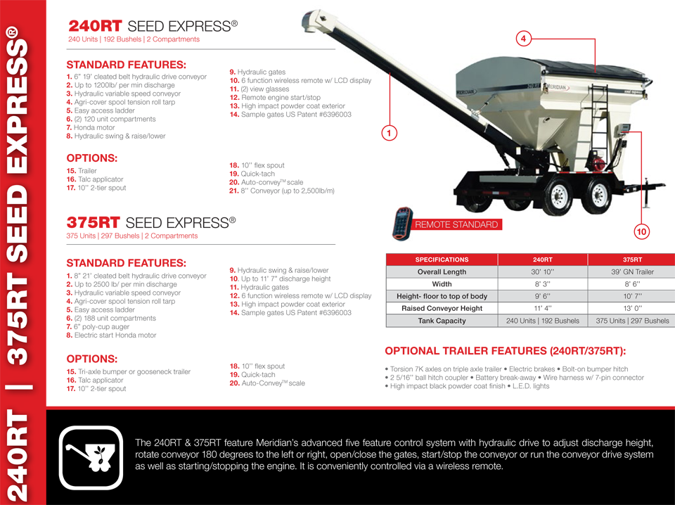 Introducing the larger capacity Self-Load Seed Express Tenders from Meridian, the next generation of seed handling. The new Seed Express 400 is a ground breaking innovation from Meridian that takes on-farm seed tendering to a new level of versatility. Its conveyor design allows the user to unload the tender, fill the tender, and also allow the user to use the conveyor independently for all your on farm needs. Now you can use the 24ft. conveyor to unload from gravity wagons or bins into a semi-trailer. Have your planter loaded up and be ready like never before with Meridian’s new 400SLD Seed Tender.400 SERIES FEATURES: